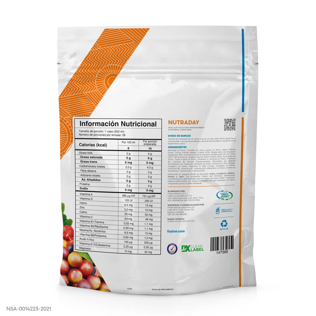 MORINGA + CAMU CAMU + ACAI BERRY + LIMÓN + ACEROLA + VITAMINAS (C, B3, A, D, B6, B1, B2, B9, B12) Y MINERALES (CALCIO,MAGNESIO, ZINC, HIERRO)