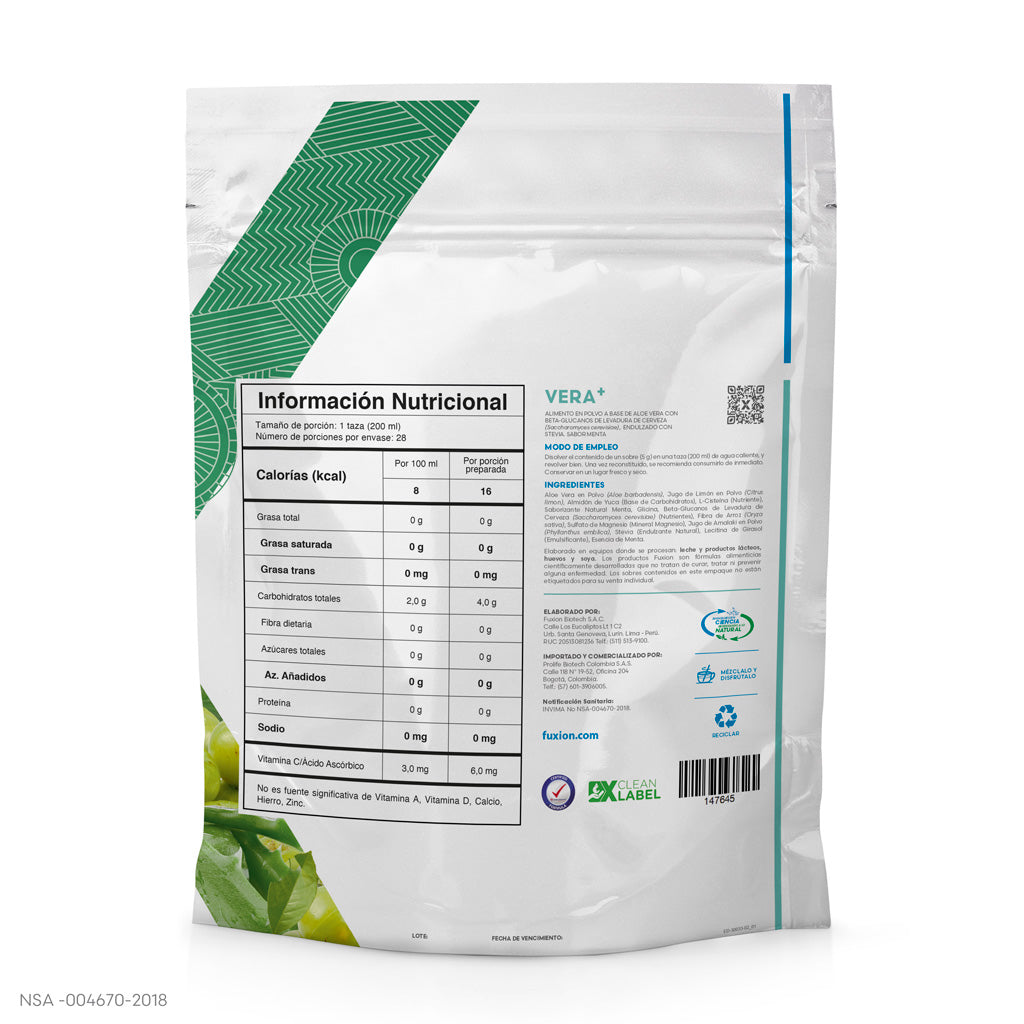 Alimento en polvo a base de aloe vera con beta-glucanos de levadura de cerveza (saccharomyces cerevisiae), endulzado con stevia. Sabor menta NSA-004670-2018