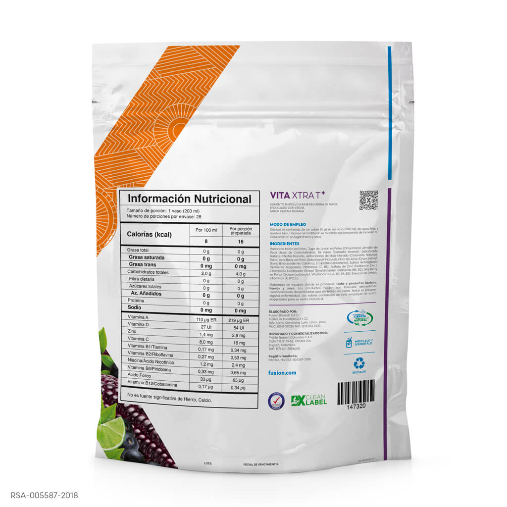 Alimento en polvo a base de harina de maca, excelente fuente de vitaminas (B1,B2,B6,C) con zinc y vitaminas (B3, B9, D), endulzado con stevia. Sabor chicha morada.